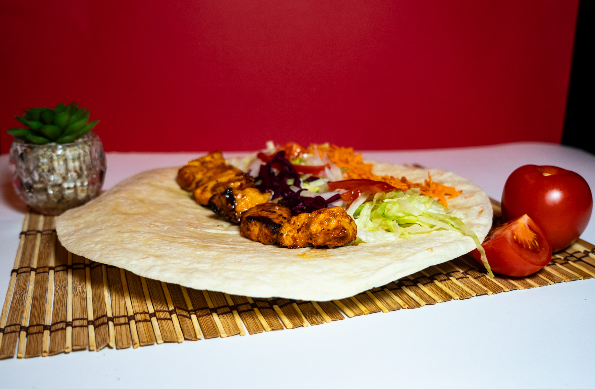 Dürüm Especial Sis Tavuk Brochetas de pollo a la parrilla con ensalada y salsa, envueltas en pan fino. Category: Dürüm Especiales